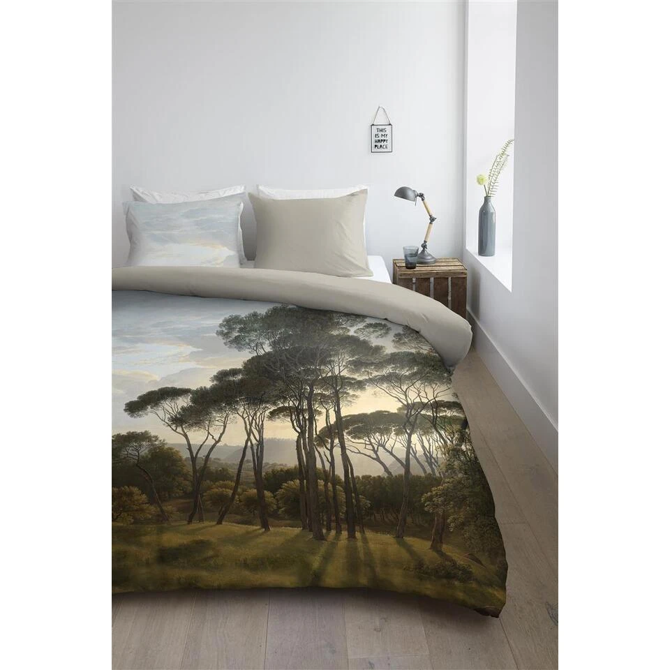 Het Ambiante Nature dekbedovertrek brengt de schoonheid van een Italiaans landschap rechtstreeks naar je slaapkamer. Het dessin toont indrukwekkende pijnbomen op de voorgrond, prachtig gecombineerd met de serene kleuren blauw, zand en ecru in de lucht. De effen zandkleurige achterzijde van zowel het dekbedovertrek als de kussenslopen voegt een rustige, harmonieuze uitstraling toe. Perfect voor liefhebbers van een klassiek en modern interieur.