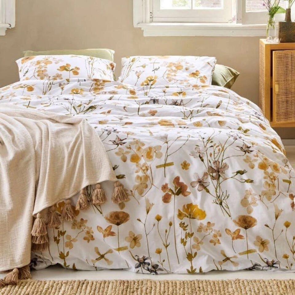 Hoe heerlijk is het om de eerste bloemen te zien bloeien in het voorjaar? Met het Ariadne at Home dekbedovertrek Flowerlove in wit haal je dat frisse lentegevoel naar je slaapkamer. Dit romantische dessin is versierd met een weelderig veldboeket van verschillende bloemen in warme tinten zoals terra, lila, oker, groen en roze. De zandkleurige ondergrond zorgt voor een rustige, natuurlijke basis, waardoor het dekbedovertrek perfect past in een landelijk, romantisch of bohemian interieur.
