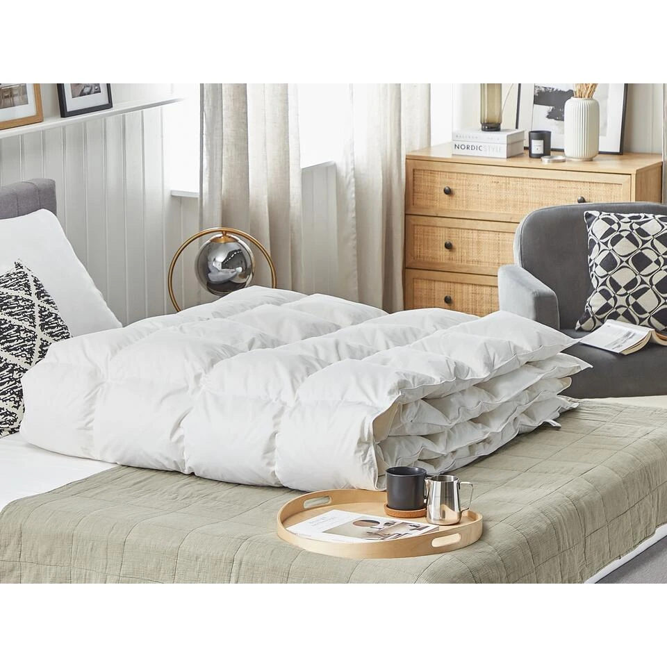 Bijzonder warm eendendons dekbed met doorgestikt raster in wit. Dit eendendons dekbed zorgt voor comfortabel warme winternachten! Door het huidvriendelijke Japara-katoen voelt het hemels zacht aan, en door het eendendons houdt het je ook bijzonder warm. Het dekbed heeft uitstekende hygiënische en isolerende eigenschappen en is warmteregulerend. Bovendien voorkomt de praktische geruite doorstikking dat de vulling wegglijdt of klontert.