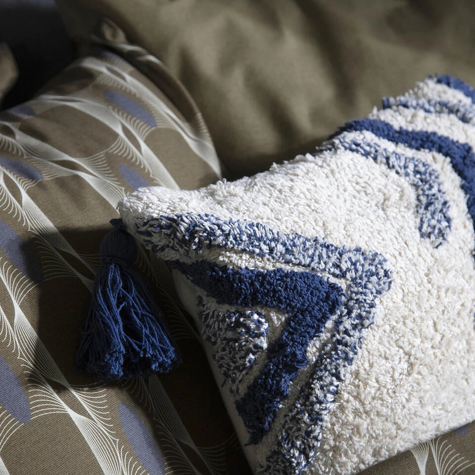Het dekbedovertrek Kente van Damai heeft een bijzonder ontwerp waarbij een fascinerend dessin het dekbedovertrek decoreert. Het samenspel van de kleuren indigo blauw en olijfgroen geeft een prachtige rijke uitstraling waarmee je de slaapkamer naar een hoger niveau tilt.