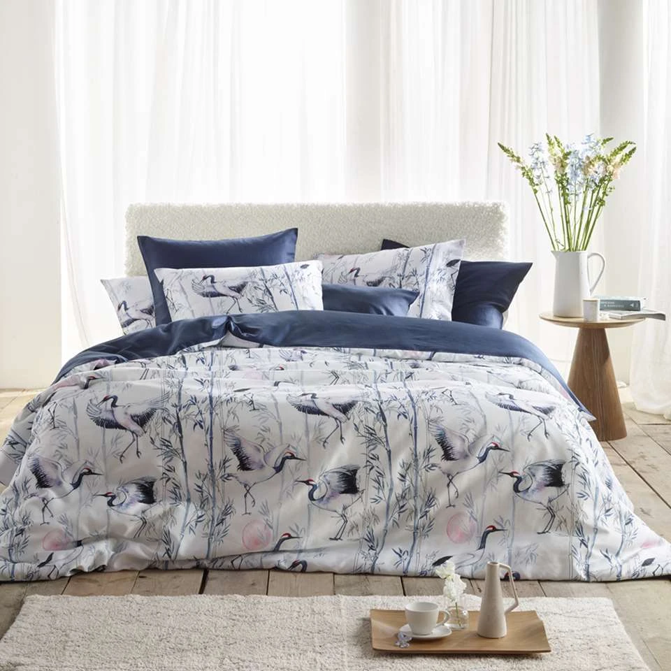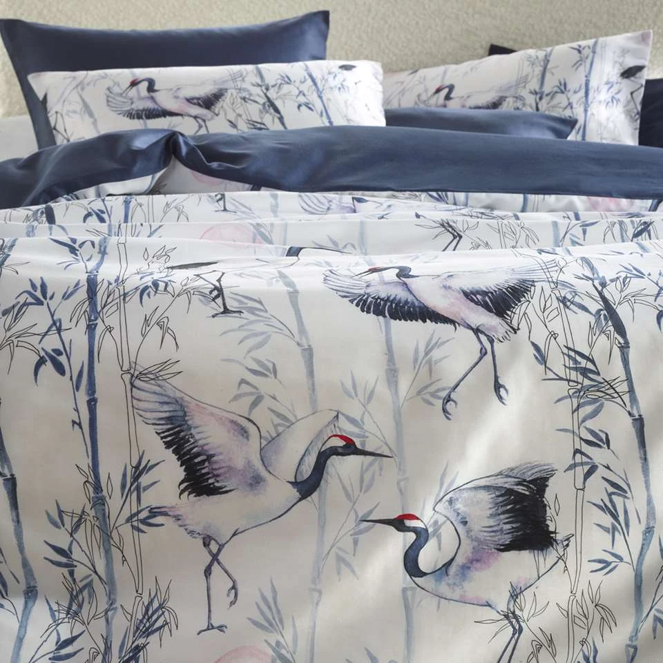 De Witte Lietaer Dekbedovertrek, Mont Blanc Majolica Blue. Prachtig satijn katoenen dekbedovertrek in hotelmaat met een hoge weefdichtheid. Het bedlinnen is een lichtgewicht katoen-satijn dat ultra comfortabel aanvoelt door de satijnbinding, het gekamd katoen en de extra zijdeglans. De hoge weefdichtheid zorgt er tevens voor dat de stof glad aanvoelt. Het dekbedovertrek en de kussenslopen zijn dubbelzijdig en dus omkeerbaar. Op de voorkant staat een dessin van kraanvogels en bamboe en de achterzijde heeft een effen kleur. Door de extra wijde flessenhals is de hoes makkelijk over het dekbed te trekken. De Witte Lietaer staat bekend om hun kwaliteitsproducten en rijke geschiedenis. Kortom, met een product van De Witte Lietaer koopt u een voortreffelijke ervaring.