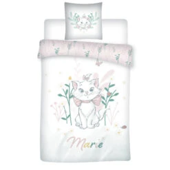 Disney Aristocats Dekbedovertrek, Marie. Fijn, katoenen dekbedovertrek van Marie, één van de bekende Aristokatten. De overtrek is dubbelzijdig bedrukt in mooi pastelkleuren, wat leuke mogelijkheden geeft bij het opmaken van het bed. Een bijpassend kussensloop van 65 x 65 cm maakt de set compleet. Een leuk cadeau idee voor een verjaardag of de feestdagen voor de liefhebber van Disney’s Aristocats.