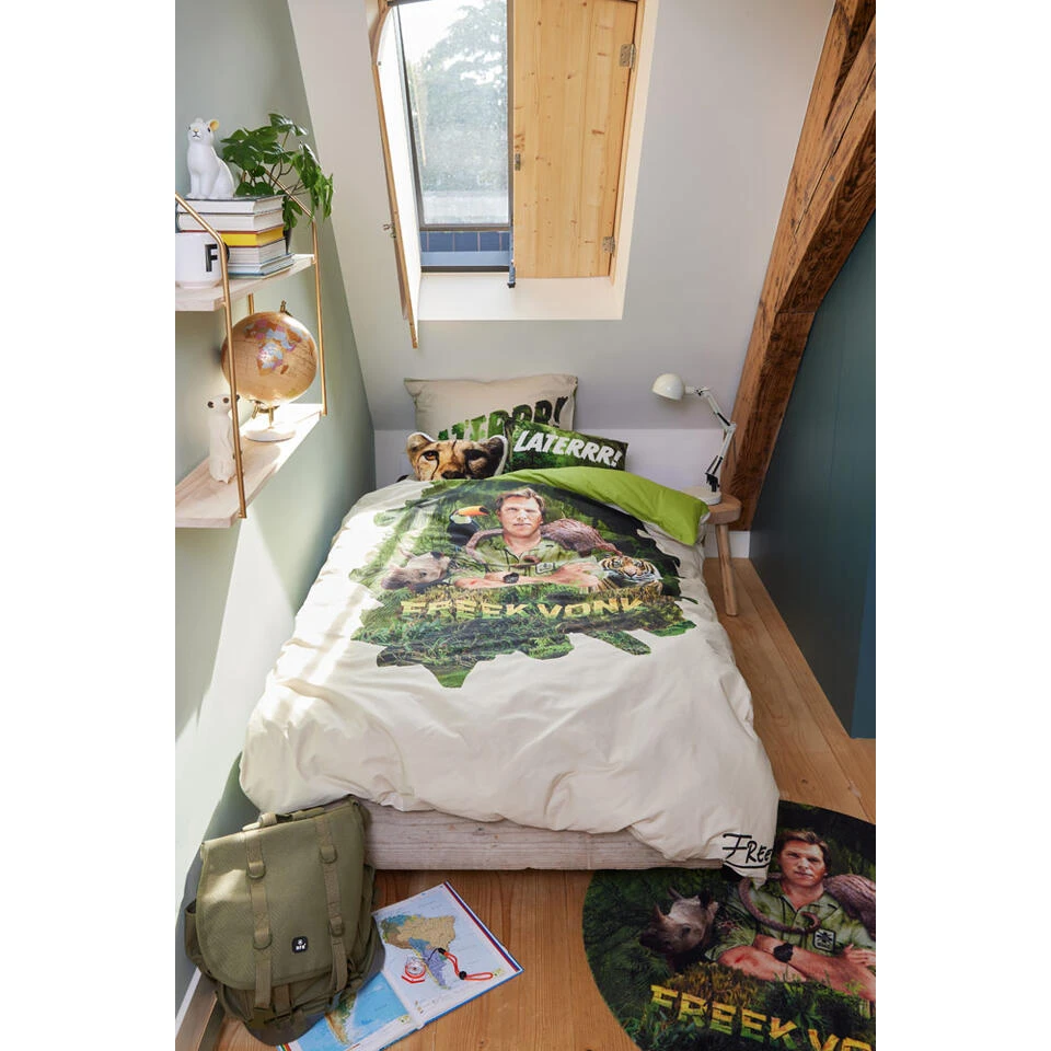 Ga met Freek Vonk mee op een spannend avontuur door de rimboe met dekbedovertrek Laterrr. Tijdens deze reis vol verwondering kom je onder andere een tijger, neushoorn en toekan tegen, gaaf! De achterkant van het overtrek heeft een effen groene kleur.