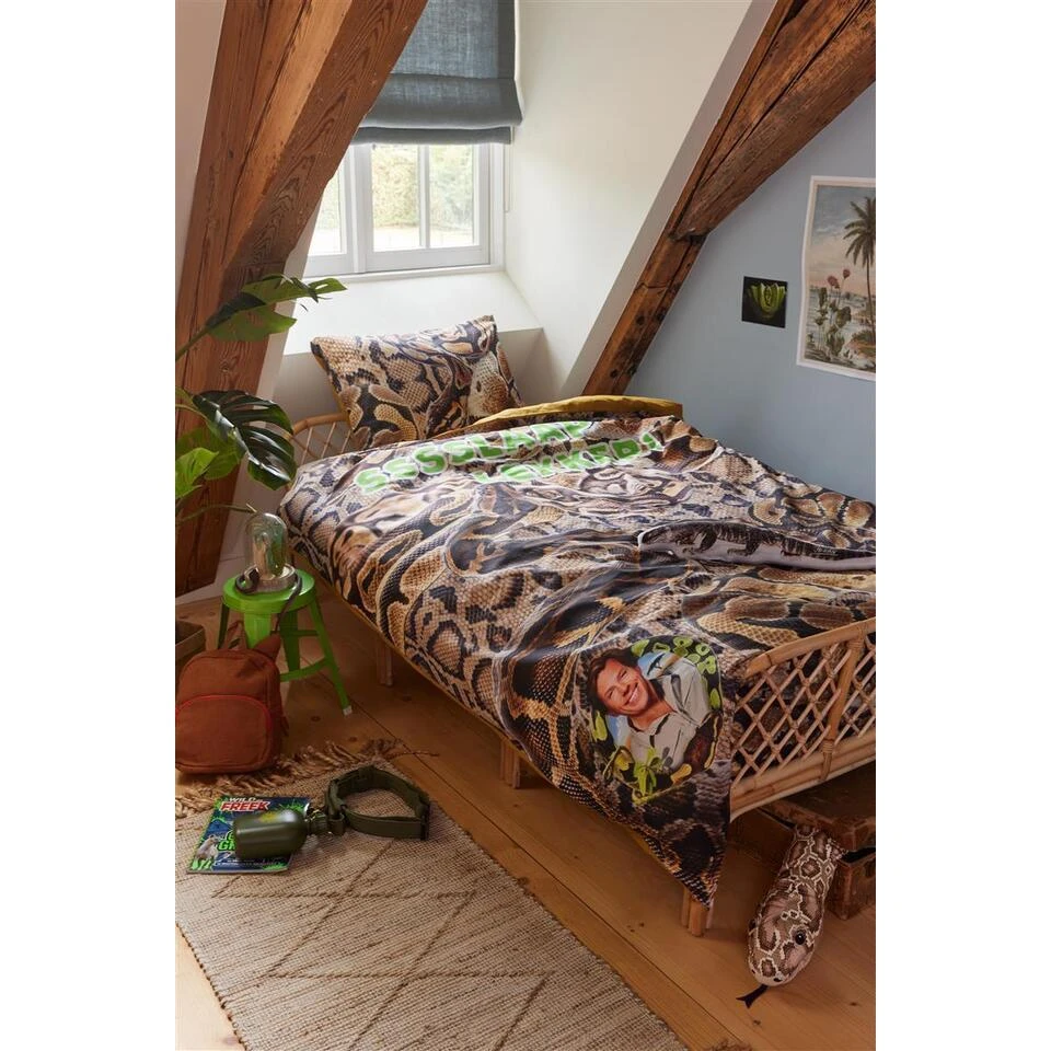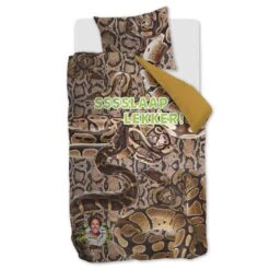 Dit dekbedovertrek krioelt van de slangen, Ssslaap Lekker! De slangen glijden over het dekbedovertrek heen, behalve over de achterkant, want dat is een effen oker kleur. Slaaplekker! Of ga jij nog lang niet sssssslapen?
