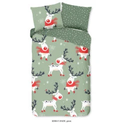 Dekbedovertrek “Dinde” van Good Morning met rendieren, in de kleur “Groen” is gemaakt van 100% geruwde 100% Cotton/ Flannel. Deze warme, zachte stof is zeer geschikt voor de wintermaanden, ademend en vocht absorberend.