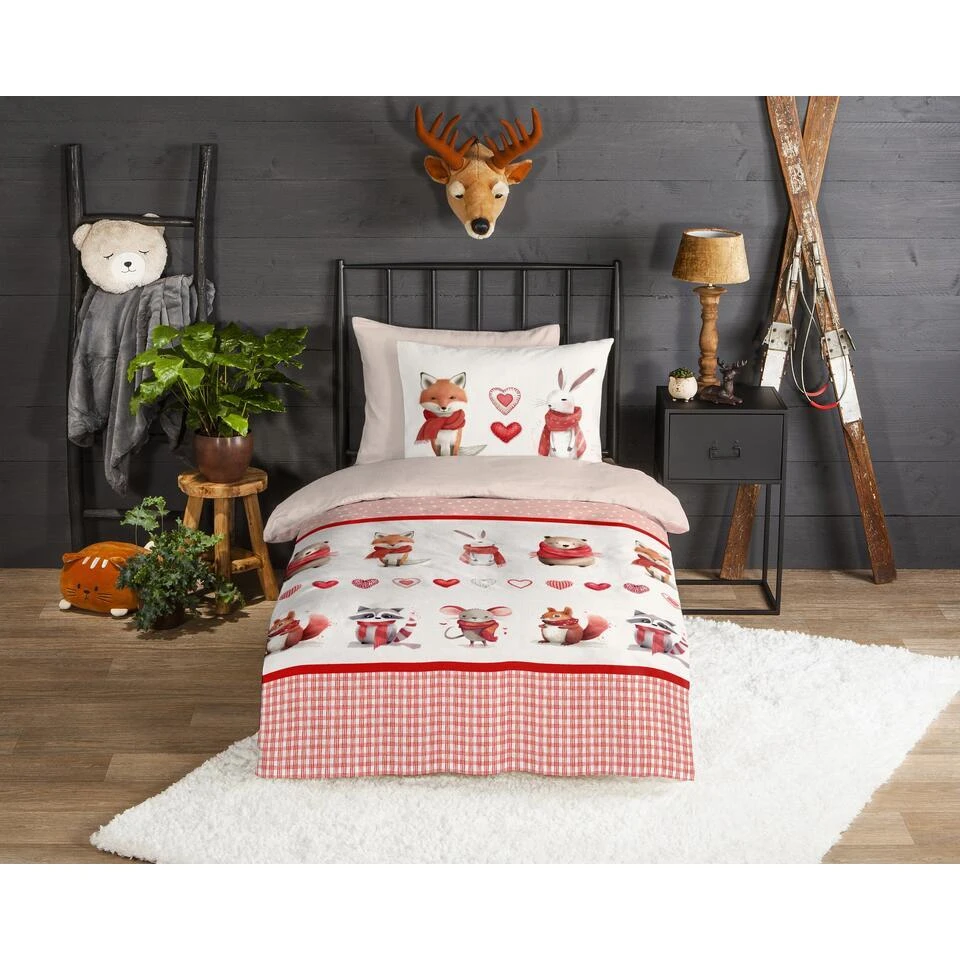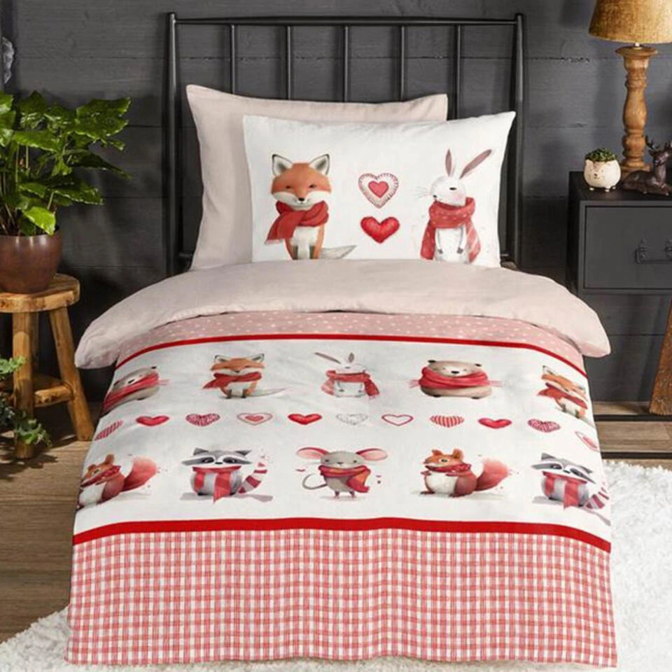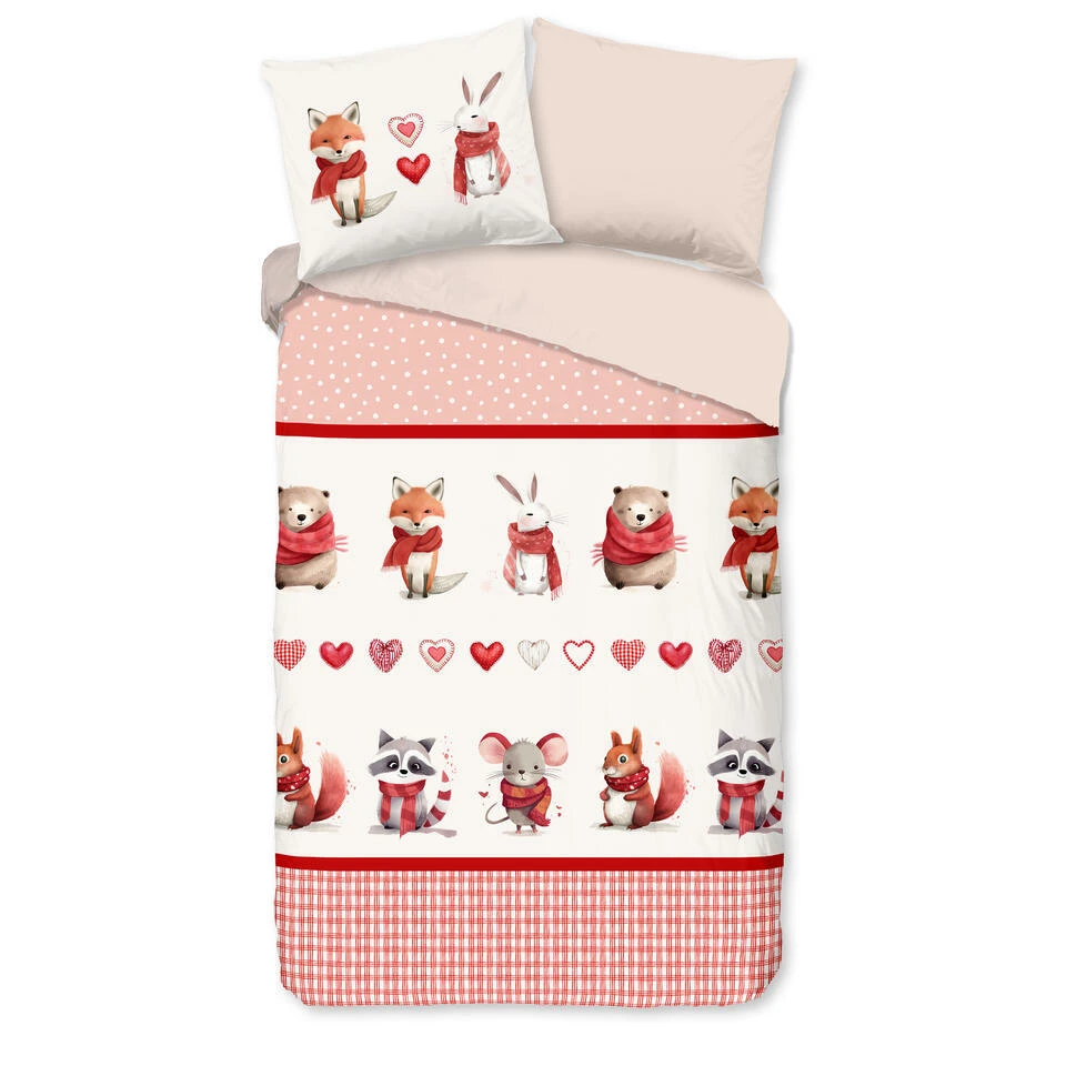 Flanellen Kinderdekbedovertrek “Timmy” van Good Morning met dieren met sjaal, in de kleur “Rood” is gemaakt van 100% geruwde 100% katoen/flanel. Doordat het katoen licht opgeruwd is, ontstaat er een zacht laagje. Deze warme, zachte stof is ademend en vochtabsorberend. Dit leuke kinderdekbedovertrek is een toevoeging aan iedere kinderkamer en is uitermate geschikt voor de koude wintermaanden.