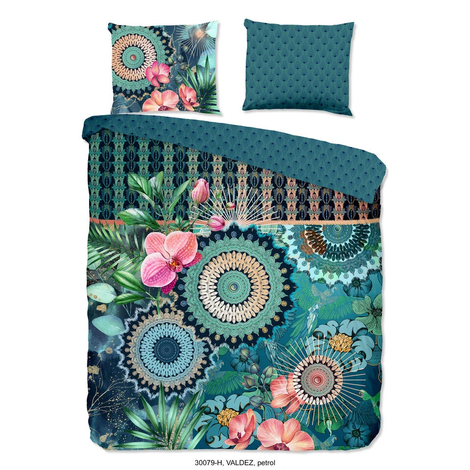 Dekbedovertrek “Valdez” van HIP met mandala’s en bloemen, in de kleur “Petrol” is een dekbedovertrek dat nooit verveelt. Deze overtrekken uit de HIP-collectie hebben frisse kleuren en unieke prints.