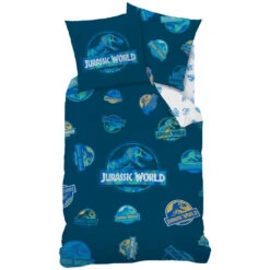 Jurassic World Dekbedovertrek, Badges. Stoer katoenen dekbedovertrek van Jurassic World. Deze spannende film over dinosaurussen was een grote hit en tot op heden spreken deze films nog steeds tot de verbeelding. Als fan van dino’s en Jurassic Park mag deze overtrek niet ontbreken in je slaapkamer. Een leuke bijkomstigheid van dit overtrek en kussensloop is, dat ze tweezijdig bedrukt zijn, zodat je kan afwisselen met het opmaken van het bed. Een geweldig cadeau om te geven tijdens de feestdagen of voor een verjaardag.