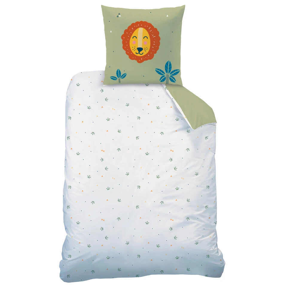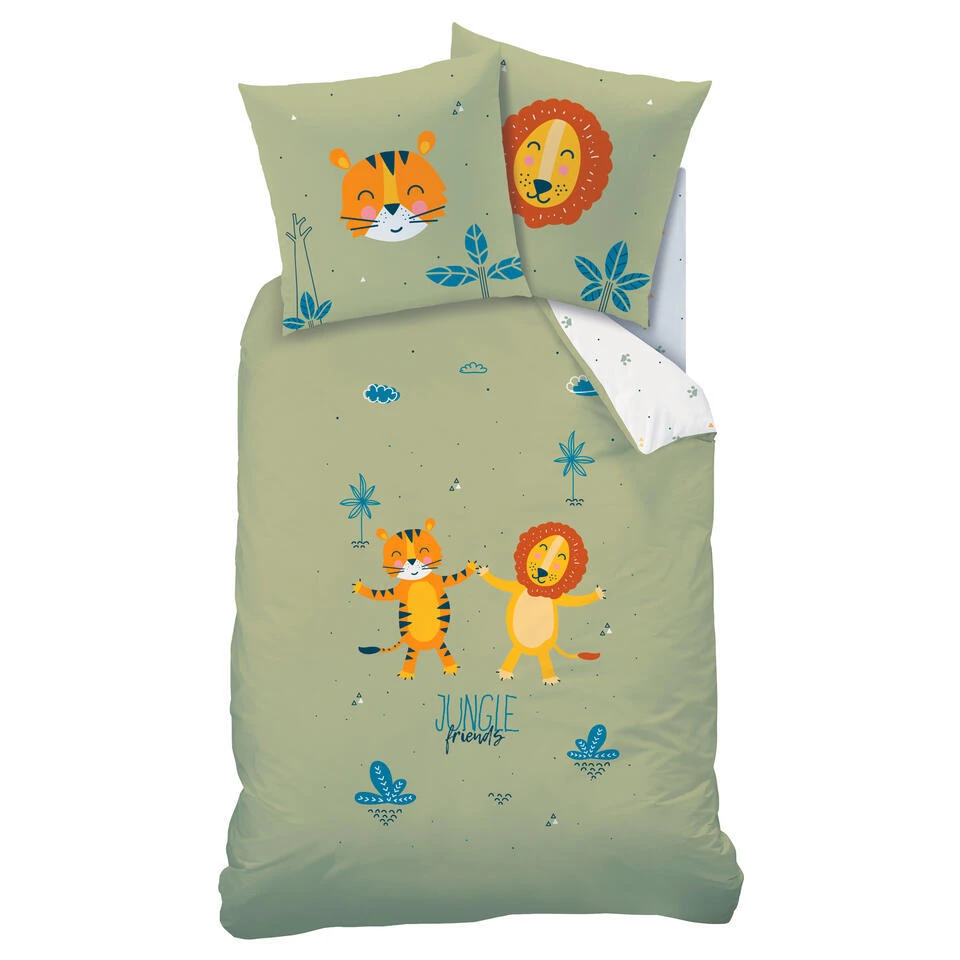 Matt & Rose Dekbedovertrek, Jungle Friends. Deze tijger en leeuw zijn beste vrienden! Een leuk katoenen dekbedovertrek welke niet zal misstaan in een jungle thema kamer. Zowel de kussensloop als het overtrek zijn omkeerbaar; met het kussensloop kan je kiezen of je de tijger of de leeuw wilt laten zien en het overtrek is aan de achterzijde wit met een kleine print van dierenpootjes. Ideaal om een keer af te wisselen! Een leuk cadeau voor een echte dierenliefhebber.