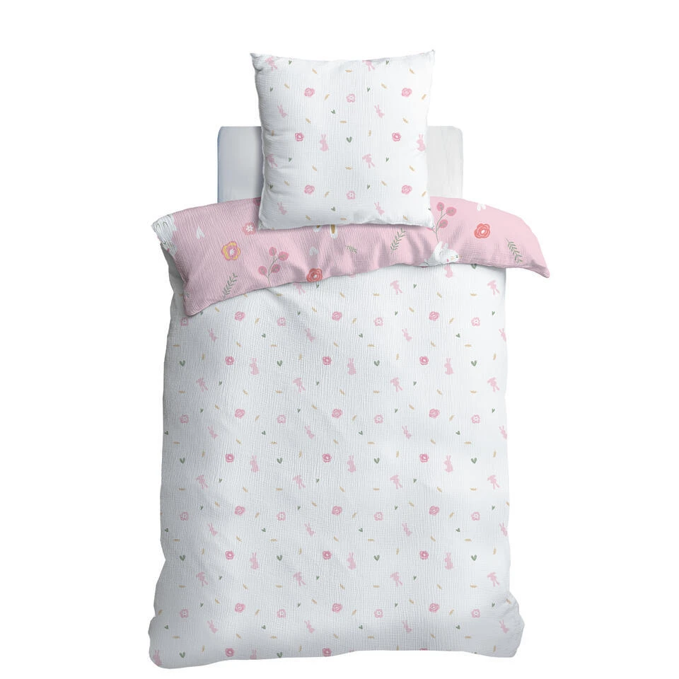 Matt & Rose Dekbedovertrek, Lapinou. Een schattig eenpersoons katoenen dekbedovertrek. Dit leuke beddengoed heeft een patroon van konijntjes op een roze achtergrond. Zowel het kussen als de dekbedovertrek zijn omkeerbaar met een contrasterende print, wat een leuke afwisseling geeft. Het katoen voelt heerlijk zacht aan, wat goede nachtrust bevordert! Een geweldig cadeau voor een verjaardag of feestdag.