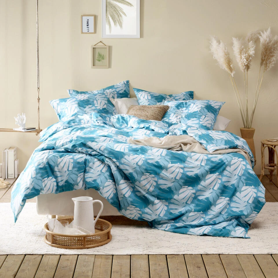 Moodit Dekbedovertrek, Odil Naxos. Dit mooie dekbedovertrek in hotelmaat uit de Odil collectie van Moodit heeft een mooie jungle print. Het overtrek past daarom uitstekend in een moderne woonstijl. De print van tropische bladen is aan beide zijden bedrukt en komt ook terug in de kussenslopen. Gemaakt van 100% katoen, wat bijdraagt aan een comfortabele nachtrust door de ademende en sterk vocht-absorberende eigenschappen. De Odil dekbedden zijn prima te combineren met de uni-color collectie Basil van Moodit. Mix and match en zet de sfeer naar jouw hand, altijd en overal!