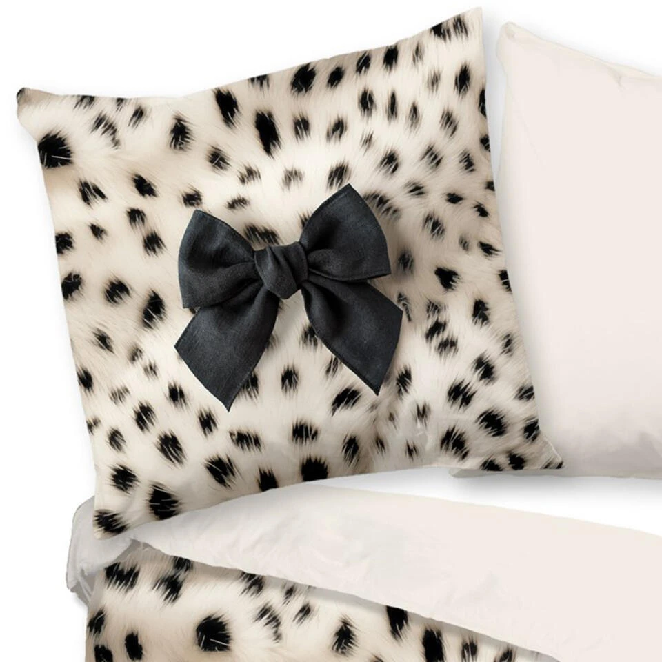 Centraal op het overtrek én op het bijpassende kussensloop staat een grote, realistisch afgebeelde zwarte strik, alsof deze op de vacht is vastgemaakt. De strik geeft een modieuze, bijna cadeau-achtige uitstraling, en maakt het geheel opvallend chic en een tikkeltje glamoureus.
