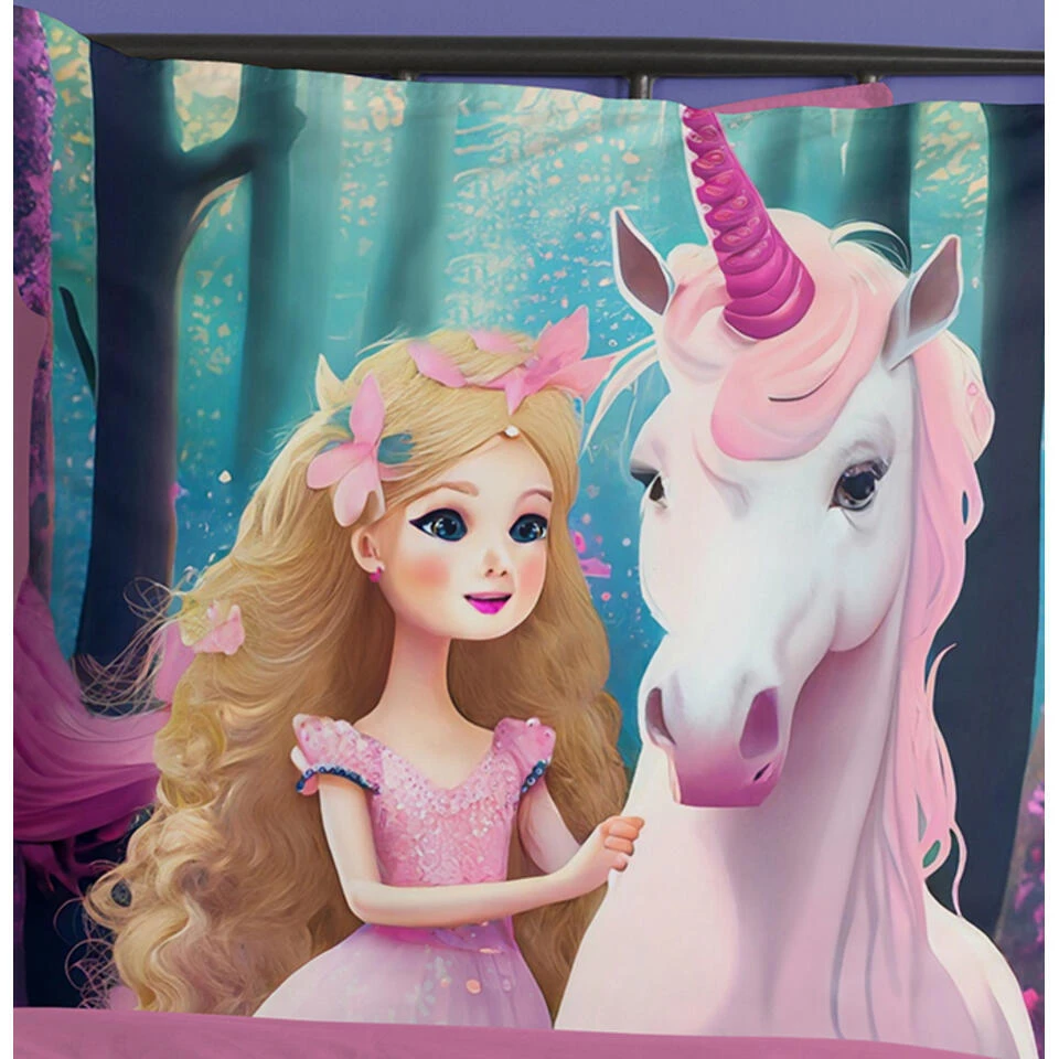 Kinderdekbedovertrek “Julia” van Pure met eenhoorn en prinses, in de kleur “Multi” is gemaakt van 100% polyester/microfiber. Het is een prettige stof, dat soepel om je heen valt en ook nog eens licht van gewicht is. Dit leuke kinderdekbedovertrek is een toevoeging aan iedere kinderkamer! Het kinderdekbedovertrek is geschikt voor ieder jaargetijde en door de lichte glans heeft het een luxe uitstraling. Na het wassen is deze stof snel droog en kreukt niet tot nauwelijks waardoor strijken (vrijwel) niet nodig is.