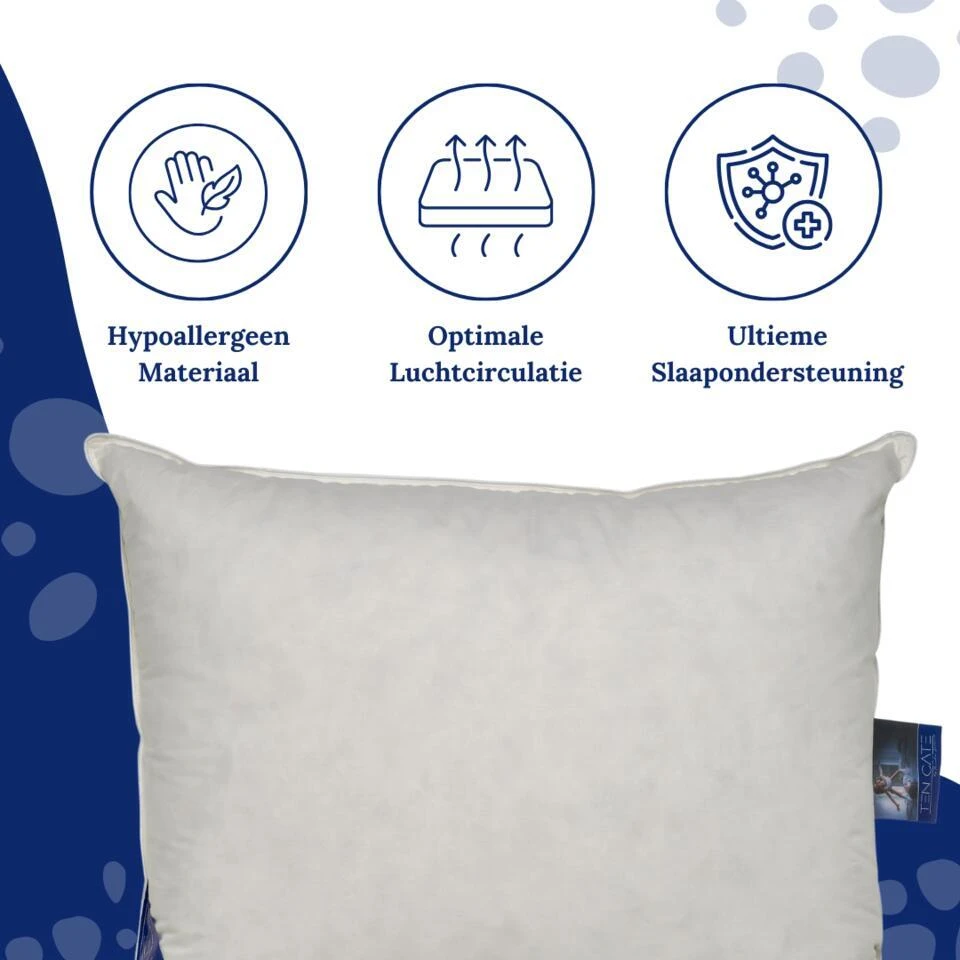Ontdek nu hét perfecte hoofdkussen voor een goede nachtrust: Het luxe donzen hoofdkussen van Ten Cate. Dit veerkrachtige maar toch stevige kussen is geschikt voor alle slaaphoudingen en biedt het ultieme comfort waarnaar je verlangt. Of je nu een buik-, rug-, of zijslaper bent, dit donzen kussen past zich perfect aan jouw slaaphouding aan. De unieke vulling van 1200 gram zorgt voor de perfecte ondersteuning tijdens uw slaap. Het eendendons zorgt voor dat heerlijke zachte gevoel, terwijl de eendenveren de juiste stevigheid bieden. Dé perfecte combinatie als je graag in verschillende houdingen slaapt.