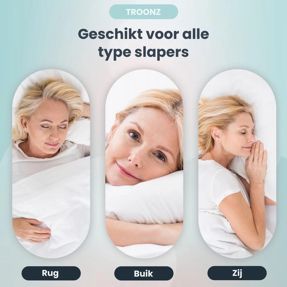 Kussens kunnen vaak de oorzaak zijn van pijnklachten en oncomfortabel slapen. Het Troonz® Six Bamboe Hoofdkussen biedt de ideale oplossing voor mensen die een pijnvrije slaap willen. Dankzij het ergonomische ontwerp en de hoogwaardige materialen kan dit kussen jouw slaap verbeteren, zodat slapeloze nachten tot het verleden behoren. Geef je nek de ondersteuning die het verdient en ontwaak verfrist!