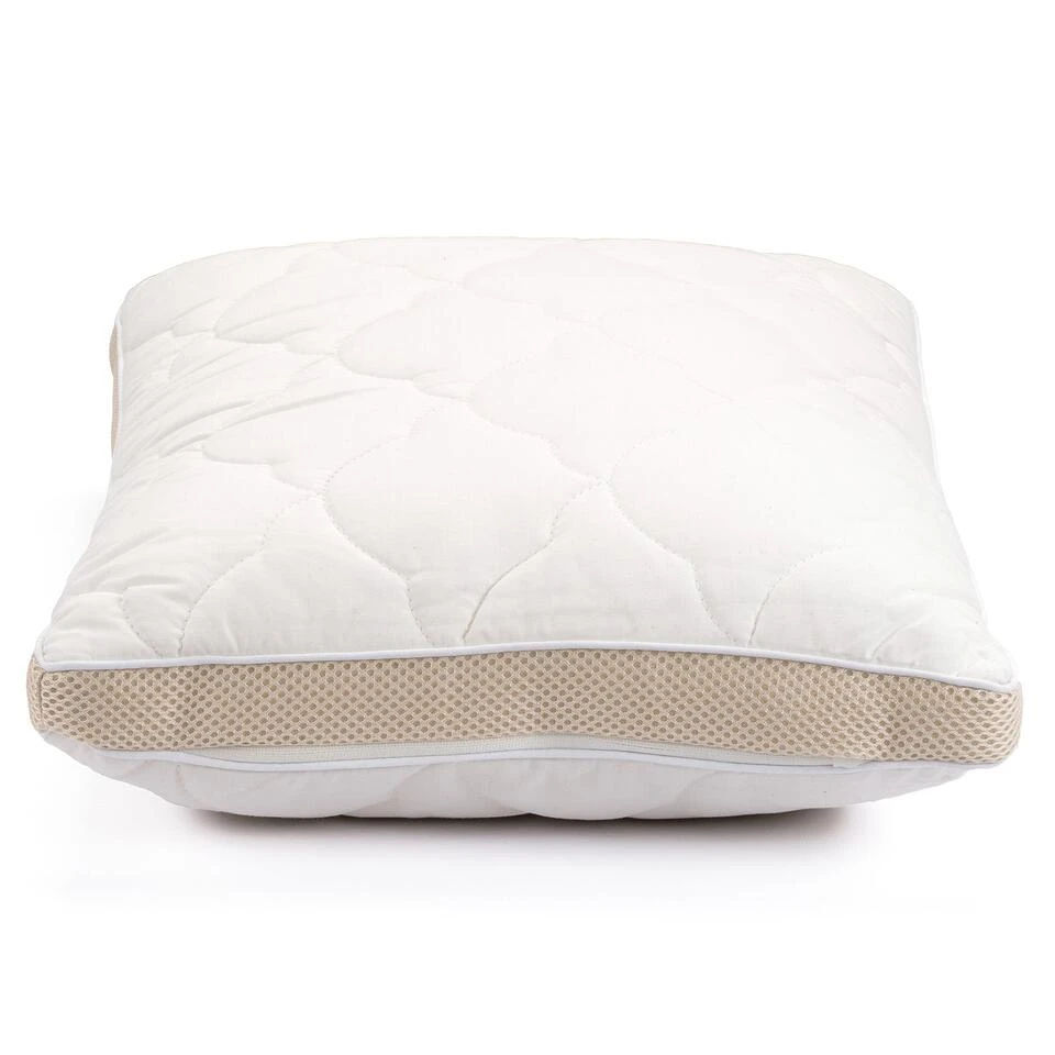 Het kussen heeft twee hoezen: een luchtdichte binnenhoes die voorkomt dat het kussen doorzakt en hierdoor levenslang de juiste vorm behoudt. En een buitenhoes van ongebleekt katoen met ingenaaide bamboevezels van 100% natuurlijke materialen. Dit is delicater en volkomen ongevaarlijk in vergelijking met de traditionele katoenen stof. De hoes is namelijk aangenaam voor de tere huid en veroorzaakt geen allergische reacties. U herkent ongebleekt katoen aan de kleine zwarte puntjes die het natuurlijke uiterlijk kenmerken.