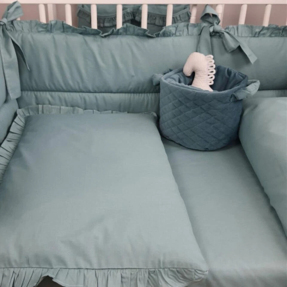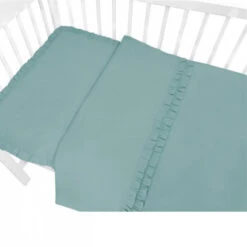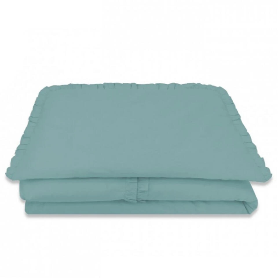 Dit peuter dekbedovertrek heeft een chique en rustgevende uitstraling door de effen groenblauwe kleur en verfijnde details. Het ontwerp is afgewerkt met sierlijke ruches langs de randen van zowel de dekbedovertrek als de kussensloop, wat een klassiek en elegant effect creëert. Daarnaast loopt er een smalle strook met geplooide ruches over het dekbedovertrek, wat zorgt voor een luxueuze en charmante afwerking.
