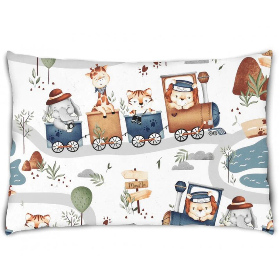 Dit dessin heeft een speelse en avontuurlijke uitstraling, perfect voor een kinderkamer. Het patroon toont een vrolijke treintje dat over een kronkelend spoor rijdt door een landschap met bomen, struiken, vijvers en bruggetjes. In de treinwagons zitten schattige dieren, zoals een olifant en een tijger, die een gezellige en fantasierijke sfeer creëren. De kleuren zijn warm en natuurlijk, met tinten van blauw, groen, bruin en oranje, wat het dessin een zachte en harmonieuze uitstraling geeft. Dit dekbedovertrek is ideaal voor kleine treinliefhebbers en dierenfans!